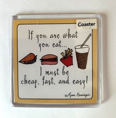 Wording on coaster: If you are what you eat…I must be cheap, fast, and easy!