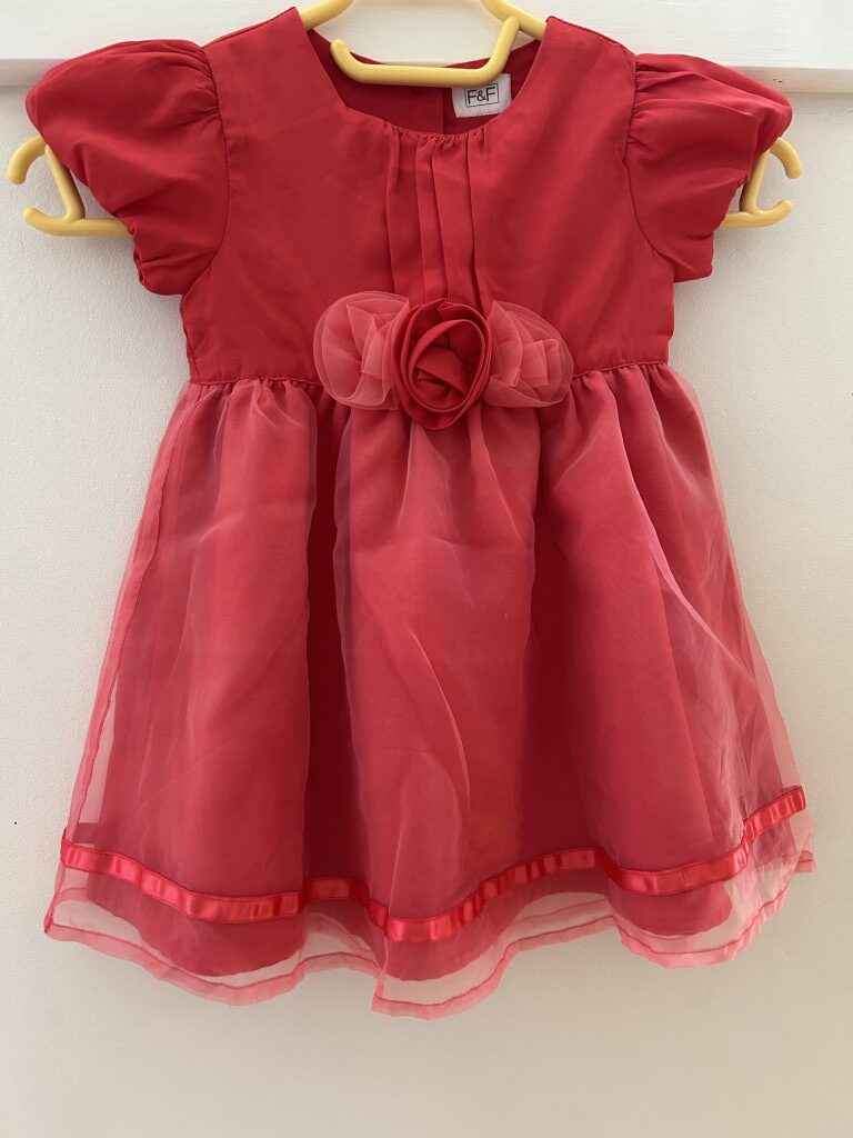 Red, girls summer/party dress, short sleeves, 3 decorative flower heads on front waist.