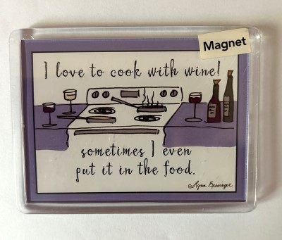 Wording on magnet: I love to cook with wine! sometimes I even put it in the food.