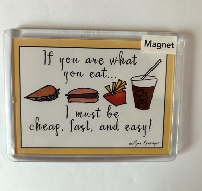 Wording on magnet: If you are what you eat…I must be cheap, fast, and easy!